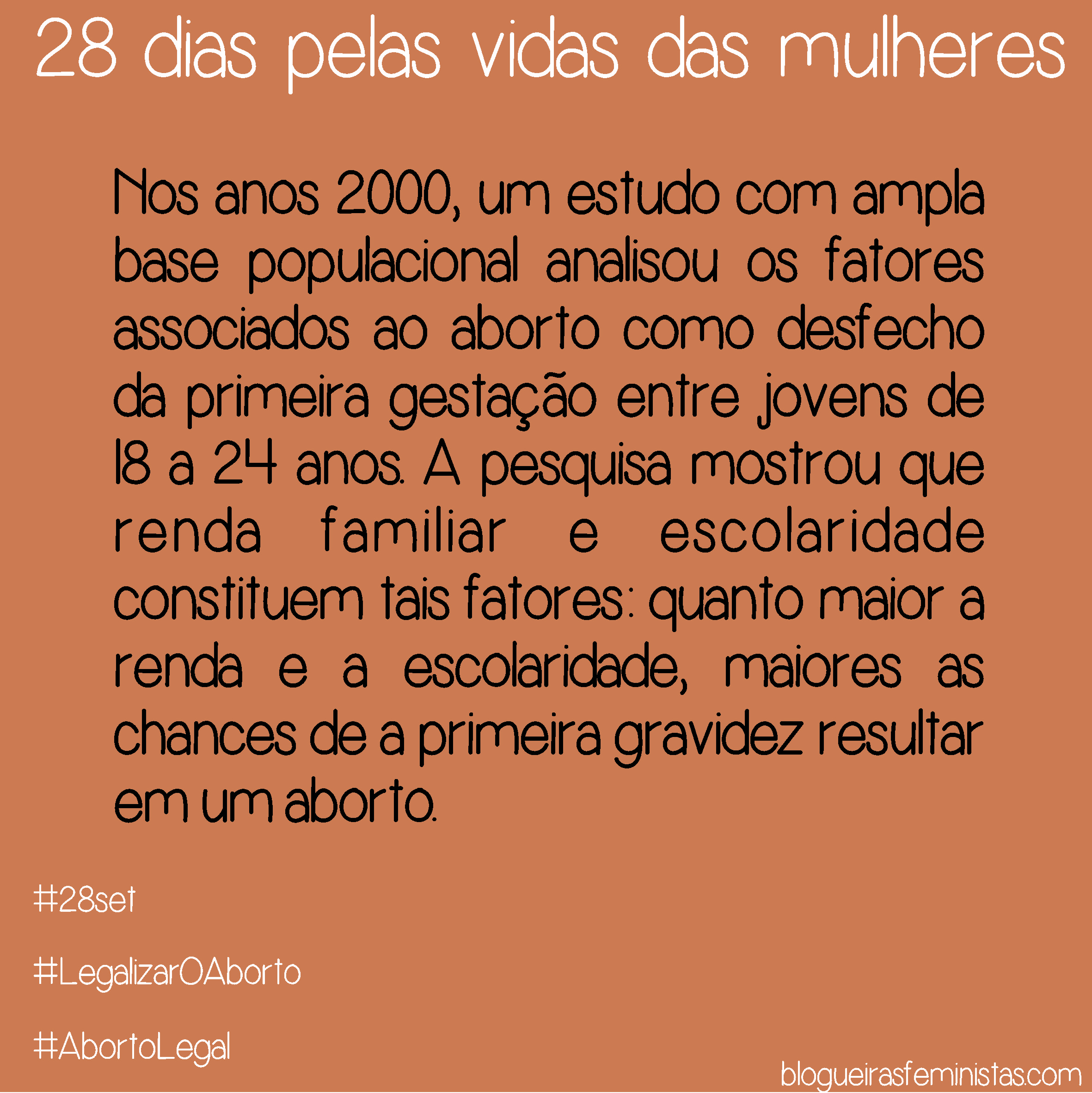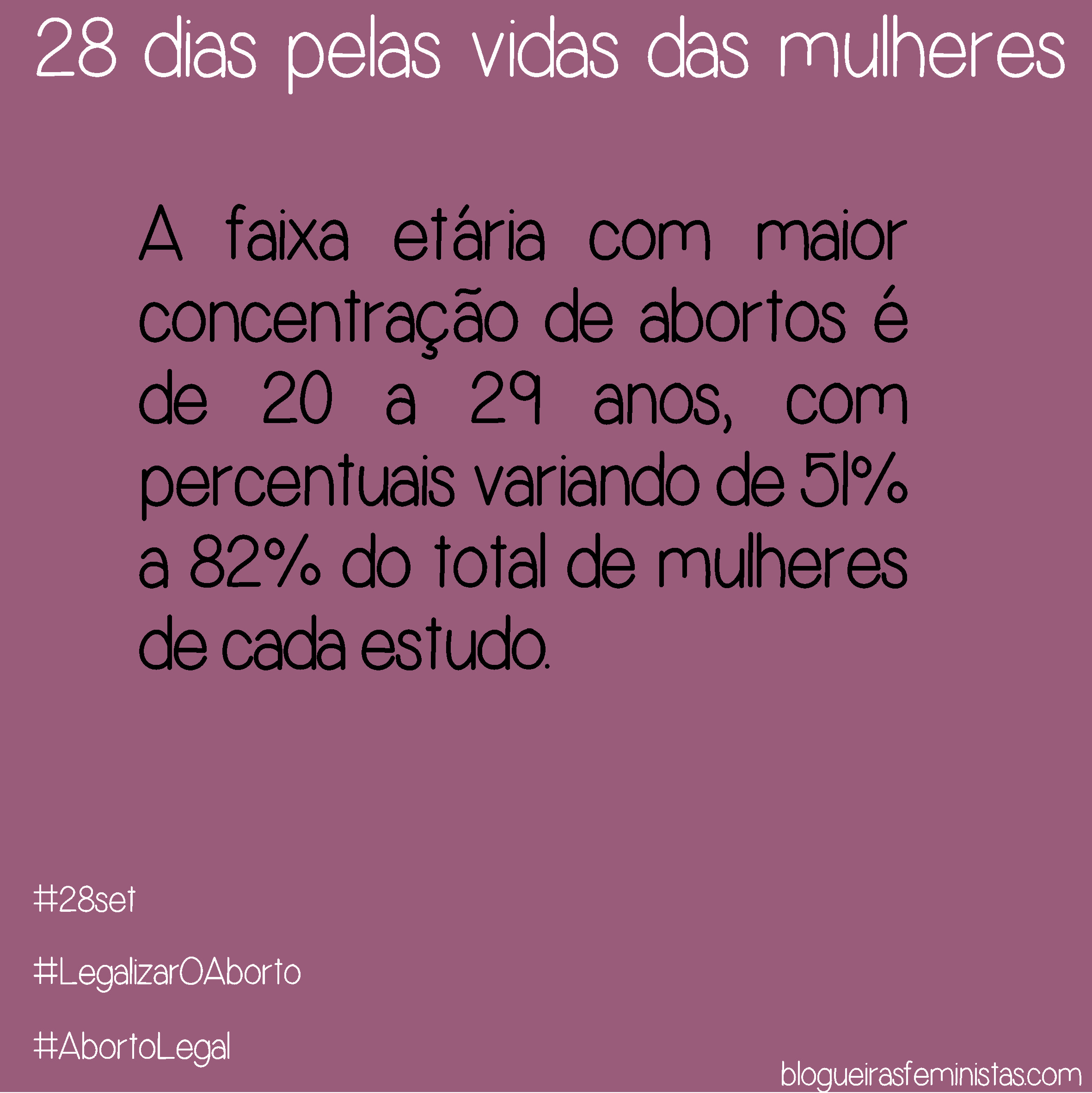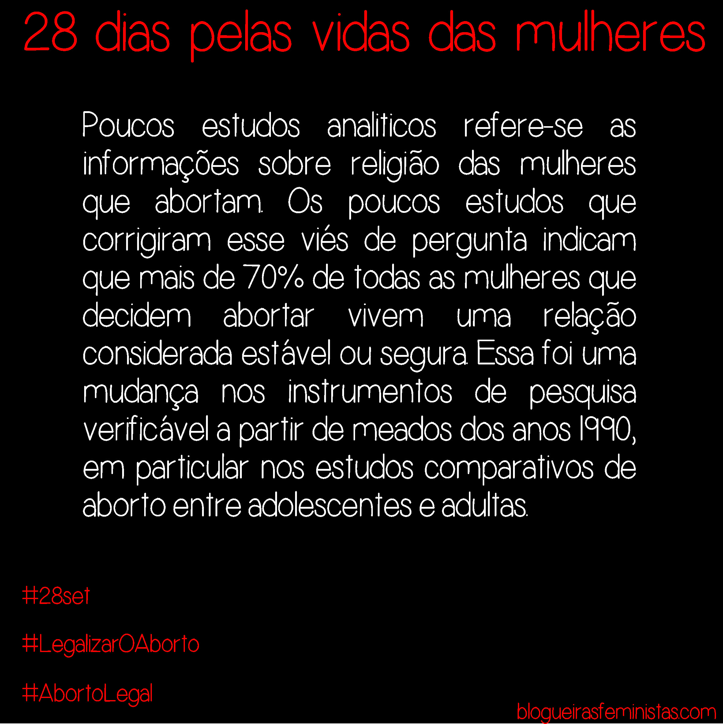 As Blogueiras Feministas lançaram uma série de memes com o perfil das mulheres que abortam para a campanha de 28 dias pela vida das mulheres. Neles, algumas informações importantes levantadas nas poucas pesquisas sobre o tema no Brasil, entre elas a Pesquisa Nacional sobre o Aborto: